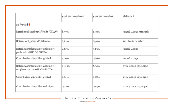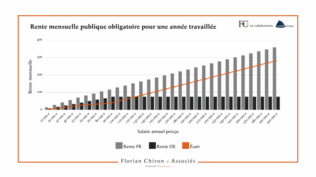 D’après nos calculs, ces 8% suffisent pour compenser la perte de revenus à la retraite entre les prestations françaises et allemandes. A la retraite, l’employé touchera une rente de son assurance, peu importe son pays de résidence.