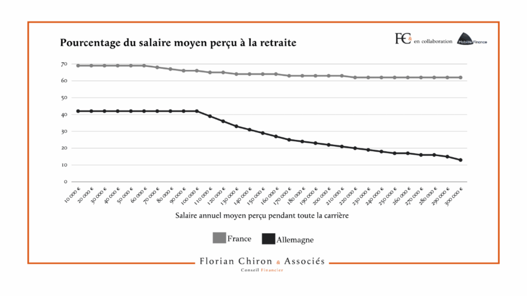 Pour les salaires vus plus haut, à 51.944€, le taux de remplacement est de 69% en France contre donc 42,40% en Allemagne. Et pour un salaire de 101.400 €, c’est 64% versus 42,40%.