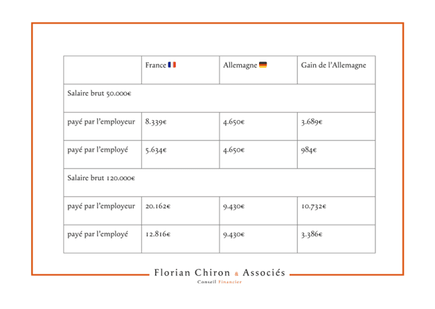 Voici, sous forme de tableau, ce qui est payé par l’employé et l’employeur d’un côté comme de l’autre du Rhin.